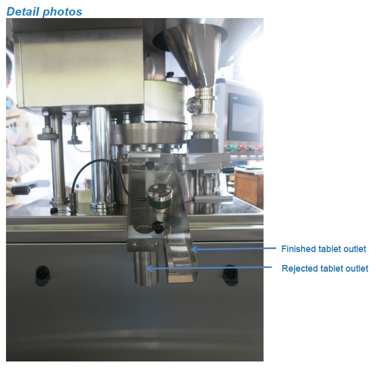 Includes: Set of Round Tooling. (6CrW2Si by hard chrome plating) (customer to specify) With Upgraded Touch Screen Controls and Dust Collector (*Siemens and/or Schneider Electrics/Components) Electrics: 3 Phase / 60 Hertz / 220 Volts, 4Kw, CE. Delivery Time: approx. 8-10 Weeks from receipt of 75% Deposit. (balance due prior to shipment from Factory) Short Video Link of Overview of the Machine: https://www.youtube.com/shorts/lbyL4Ef7Ew0 Short Video Link of Machine to Power: https://www.youtube.com/shorts/6-0rinhqPds Video Link Testing Machine with Powder (watch until the end) https://www.youtube.com/watch?v=8hY6ELnJkzw Specifications: Punch shaft diameter (mm) 19 Dia diameter (mm) 30.16 Dia height (mm) 22.22 Capacity: (pcs/h) Max 75,000(depending on size) Main pressure (KN) 80 Pre pressure (KN) 12 Max tablet diameter(mm) 16 Max tablet length(mm) 18.5 Max tablet thickness(mm) 10 Max filling depth (mm) 20 Machine dimension (mm) 900x720x1500, Weight 675Kg *(Subject to Manufactures comparable configuration) Features: 1. Main pressure of 80KN and Pre-Pressure of 12KN. 2. Equipped with safety interlock function. 3. Columns are durable material made from steel. 4. Tooling parts can be freely adjusted or removed which is easy for maintenance. 5. Main pressure, Pre-Pressure and feeding system all adopt modular design. 6. The upper and lower pressure roller are easy to clean and disassemble. 7. The main drive system, lubricating system, and knobs adjustment mechanism are completely sealed by the left and right door panels, rear door panels and control cabinet through sealing strips to prevent dust from polluting the machine. 8. Pressure roller is alloy tool steel with high hardness to ensure the continuous use. 9. Easy-to-operate interface for seamless adjustments, monitoring of production process. 10. Built with high-quality materials to ensure long-lasting performance and minimal maintenance. 11. Small Footprint with high capacity and exceptional speeds, 12. It offers robust performance, throughput rates without compromising quality. Design: 1. Covers an area of only 0.6㎡. 2. Low noise < 75 db . 3. Excellent performance for difficult-to-form materials. 4. With a single tablet rejection system. 5. Adopt advanced double-lifting guide rail technology for upper punches, That improves tablet ejection and better balance and smoother motion. 6. Intelligent tablet weight control, pressure monitoring function, auto weight adjustment. 7. Automatic reject for unqualified tablets. 8. Force feeder with impellers with central feeding, which guarantee the flow of powder and ensures the accuracy of feeding. 9. Well-designed press powder plate for a tight seal, it helps reduce powder dispersion and spillage, improving material cleaning. 10. Turret dies hole by precision-enhanced CNC machine, the dies fasten screws are by full-surface fasten design, providing a tighter and more secure fasten. This allows for safer operation and enables manual installation of dies without any tools. 11. Equipped with large area dust absorbing device connect with dust collect system. 12. Material contact part is SUS316L stainless steel for pharmaceuticals. 13. With central oil lubrication system, lubrication can be set through touch screen. 14. With formula save and use function, utilization and minimizing production loss. It also guarantee the tablet press room 15. Adopts PLC and overload protection. 16. Replacement filling cams for a wide range tablet thickness. 17. Production information report and parameter can save to U disk. 18. Designed of electrical cabinet located at the rear of the machine, Ensures complete separation from compression area, effectively isolating the electrical components from dust contamination. *(Subject to Manufactures comparable configuration) Featured New High Speed 17 Station Rotary Tablet Press Model TEU-17H Location: Factory | |