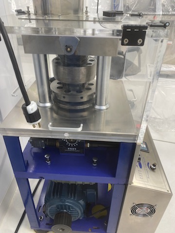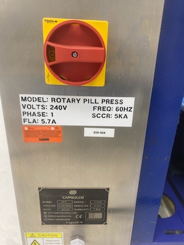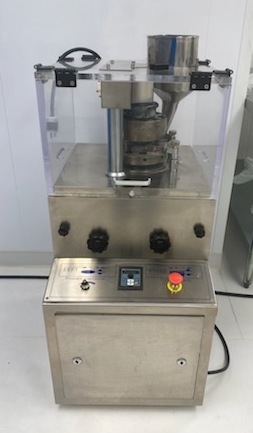 Includes: 1. Set of Round Tooling Features: maximum operating pressure of 6 tons Maximum Tablet Diameter: 20mm Maximum Tablet Thickness: 6mm Max Fill Depth: 15mm Speed of turret: 0 to 30 RPM Unit is capable of producing up to approx. 14,000 tablets per hour (depending on size and operator) Includes: a Stainless Steel product hopper, Open Feed Frame start-stop and variable speed controls Comes with plexi-glass guarding around the turret and die table. Overall Dimensions: 480x630x1100mm, approx. 300Kg Electrics: 1 Phase / 60 Hertz / 240 Volts, 5KA, 5.7A (FLA) Was ESA Electrically Certified Was purchased a couple of years ago and Never used. Delivery Time: approx. 1 week. Featured Electrics: 1 Phase / 60 Hertz / 240 Volts, 5KA, 5.7A (FLA) Location: Toronto | |