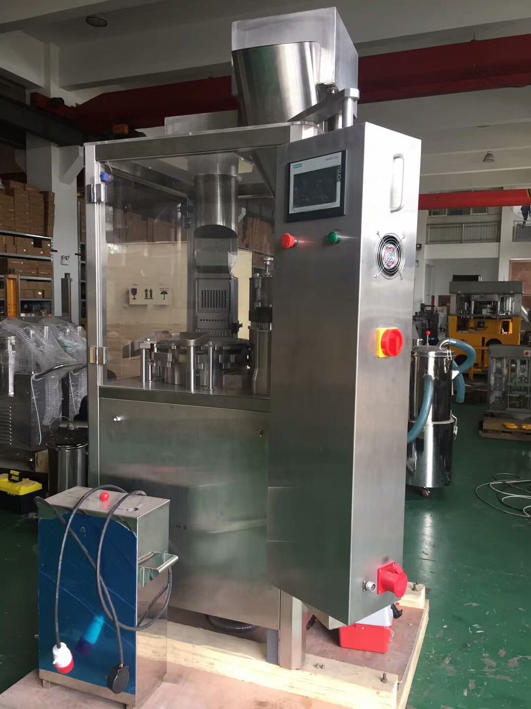 New Automatic Capsule Filler Model 1200 with 1. Set of Change Parts.(Customer to specify) Can order other sizes for additional cost. Can fill capsules “00”, “0”, “1”, “2”, “3”, and “4”. Maximum output: 1,200 capsules per minute, 72,000 per hour. Features: all stainless steel construction (and exceeds GMP Standards) 9 hole x 10 capsule filling segments, electronic capsule and powder level detecting systems, vacuum pump, dust collector, faulty capsule reject station, and English PLC Touch Screen Controls, Transducer, and Relays, has integrated safety doors with automatic shut off if opened and emergency stop buttons, and Dry Vacuum Pump, double layer seal at side, and dust proof. Electrics: 3 Phase / 60 Hertz / 220 Volts, CE. Overall dimensions: 32” long by 39” deep by 78” high. Delivery Time: approx 8-10 weeks from receipt of 65% deposit.(balance prior to shipment from factory) Video Link: https://www.youtube.com/watch?v=yLLYPkmy5J8